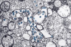 Transmission electron microscope image of an isolate from the first US case of COVID-19. Viral particles in blue, viral genome as black dots. Credit: CDC Newsroom Image Library